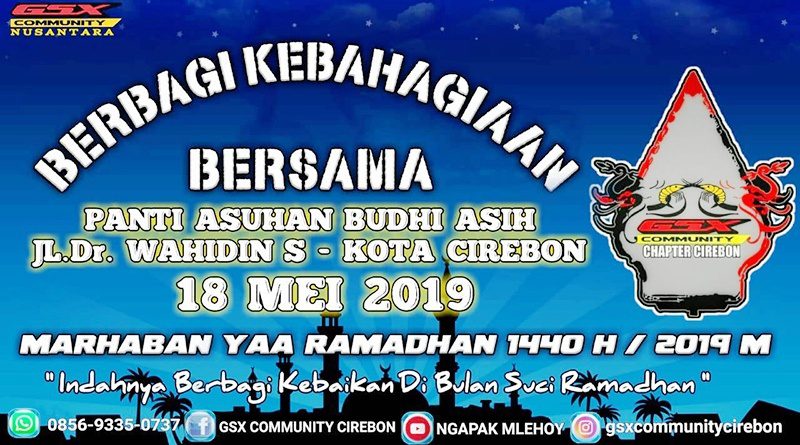 AlanBIKERS.com – Salah satu kegiatan positif untuk mengisi bulan Ramadhan 1440H, para bikers pengguna Suzuki GSX-S/R150 yang berada di wilayah Cirebon melaksanakan bakti sosial (Baksos) di Yayasan Budhi Asih, Jl. Dr. Wahidin Sudirohusodo No.22, Sukapura, Kec. Kejaksan, Kota Cirebon, Jawa Barat, Sabtu (18/5).