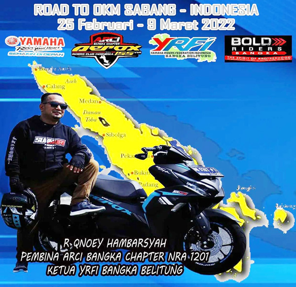 Dari Palembang lanjut menyeberang ke Pulau Bangka pada tanggal 8 maret 2022 dengan jumlah total perjalanan selama 12 hari. “Tidak lupa saya ucapkan terimakasih banyak kepada CV. Sumber Jadi, Main Dealer Yamaha Bangka Belitung lalu Bold Riders Bangka serta saudara-saudara bikers di Pulau Sumatera yang telah melakukan pemantauan dan pengondisian selama dalam perjalanan dari berangkat sampai kepulangannya,” tutup Bro Kinoy.
