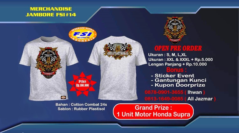 Seperti yang disampaikan Bro Alam (CSM) selaku Ketua Panitia Jamnas ke 14 bahwa panitia Jamnas juga telah menyiapkan Grand Prize berupa 1 unit Honda Supra. “Untuk mendapatkan hadiah utama itu, undangan cukup membeli kaos event dan akan diundi pada saat acara berlangsung,” tutup Bro Alam. (FSI/AB)