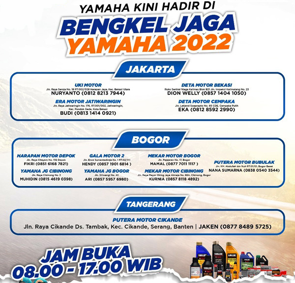 AlanBIKERS.com – Melengkapi kegembiraan untuk masyarakat yang menyambut libur lebaran, Yamaha DDS Jabodetabek akan mempersiapkan Bengkel Jaga Yamaha pada 30 April hingga 4 Mei 2022 mendatang, di beberapa bengkel area Jabodetabek.