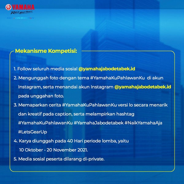 - Membagikan cerita terkait foto secara menarik dan kreatif pada caption, serta melampirkan hashtag #YamahaKuPahlawanKu #YamahaJabodetabek #NaikYamahaAja #LetsGearUp