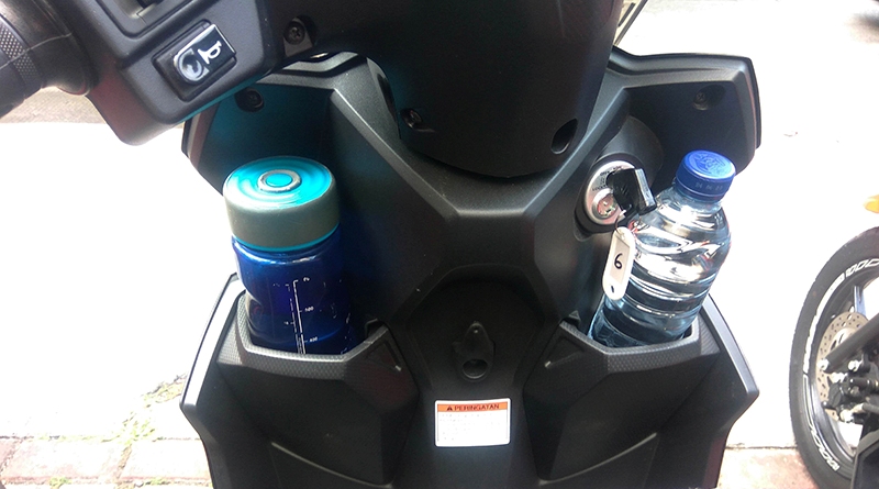 Lebih menariknya lagi adalah ruang kompartemen depan atau dudukan tempat meyimpan barang yang terletak dibawah stang. Disini AB.com sengaja meletakan 1 botol minuman lagi yang lebih besar dari pada botol air mineral ukuran sedang (600 ml), kedua botol tersebut sengaja sesekali dipindahkan posisinya antara kiri dan kanan bergantian.